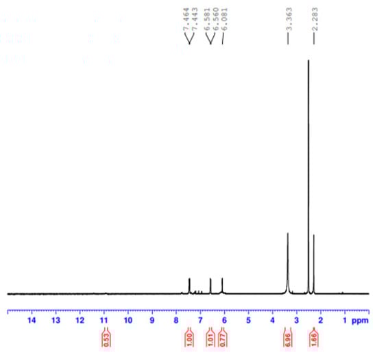 Figure 5 displays the 1H NMR spectrum of the OA complex with Zn(II) ions. In this spectrum, the signal at 2.283 ppm corresponded to the protons of the –CH3 group of the –CH2CH3 moiety, while the signal at 3.363 ppm was attributed to the protons of the –CH3 group attached to the piperazine ring. The signal observed at 6.081 ppm could be assigned to the protons of the –CH2 group in the (–O–CH2–O–) moiety, whereas the signals resonating at 6.560 and 6.581 ppm could be attributed to the protons of the –CH2 group in the –CH2CH3 moiety. The signals ranging from 7.443 to 7.464 ppm were generated by the aromatic protons, while the signal at 3.363 ppm could be attributed to coordinated water molecules. The signal resulting from the proton of the –COOH group, typically located around δ~11.0 ppm in the 1H NMR spectrum of the free OA molecule, was no longer observed in the spectrum of the Zn(II) complex. The absence of the 1H NMR –COOH proton signal, coupled with the disappearance of the characteristic FT-IR band associated with the ν(C=O)COOH vibrations, supports the deprotonation of the –COOH group and its involvement in complexation with the Zn(II) ion.
