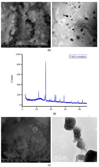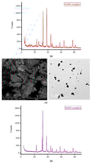 (a) The XRD diffractogram, SEM, and TEM micrographs of Fe(III) complex. (b) The SEM and TEM micrographs of Zn(II) complex. (c) The SEM and TEM micrographs of Ca(II) complex. (d) The SEM and TEM micrographs of Mg(II) complex.