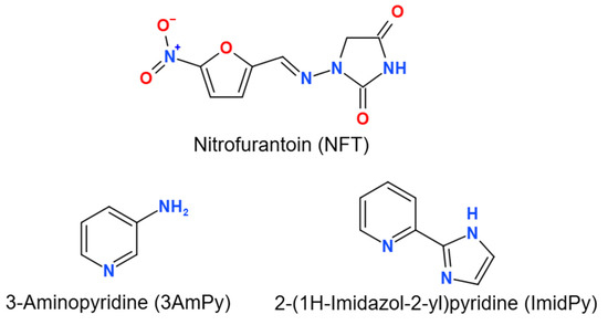 Nitrofurantoin is an antibacterial drug compound (Figure 1) that belongs to class IV of the Biopharmaceutics Classification System [29,30] due to its low water solubility and permeability [31,32]. A large number of NFT multicomponent solid forms with derivatives of pyridine, benzamide, benzoic acid, carboxylic, and amino acids have been obtained for the last decade [29,30,33,34,35,36,37,38,39]. In the paper devoted to the study of the NFT cocrystals with four structurally related carboxamide compounds [37], a Cambridge Structural Database (CSD) analysis was carried out, which showed a high probability (63.4%) of the -Nim–H⋯Npyr hydrogen bond heterosynthon formation for the compounds that have the cyclic imidedione fragment in the structure. However, it is not possible to make reliable assumptions about the possible synthon hierarchy in potential NFT multicomponent crystals. This is due to the high diversity in the molecular packing and hydrogen bonding motifs of the known NFT multicomponent crystals caused by different functional groups in the coformers.