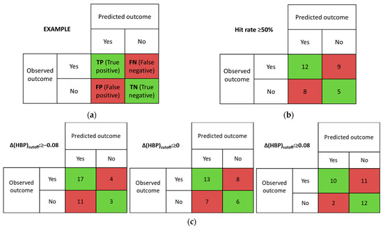 Example of confusion matrix (a) and confusion matrixes determined from (b) MC (Hit rate cut-off value of 50% was used) and (c) multicomponent HBP (Δ(HBP) (cutoff values of −0.08, 0.00, and 0.08 were used).