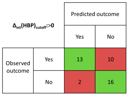 In our work, we have decided to analyze the influence of the chosen discrimination threshold on the efficiency of the method. Since the average uncertainty statistical value of the method is 0.08 [42], we estimated the effectiveness of the HBP model with Δ(HBP)cutoff: −0.08; 0 and 0.08 (Figure 3c). Indeed, as the Δ(HBP)cutoff threshold is lowered, the number of true positive hits increases. However, increasing the number of false negative hits obviously leads to increasing the number of unsuccessful trials. Increasing the threshold value of Δ(HBP)cutoff results in a significant reduction in false negative hits.