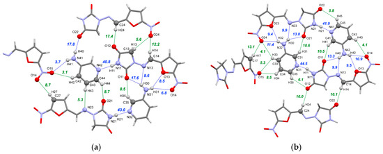 Part of the hydrogen bond network in Form I (a) and Form II (b) of the [NFT+3AmPy] cocrystal (1:1). The numbers correspond to the interaction energies of “classical” hydrogen bonds (blue dotted lines) and C–H⋯O/N hydrogen bonds (green dotted lines) in kJ·mol−1 estimated using Equation (2).