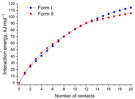 From the packing energy perspective, the polymorphic forms of [NFT+3AmPy] (1:1) can be distinguished by the distribution of non-covalent energies of the packing motifs. For example, 50% of the total lattice energy of Form II estimated using QTAIMC is contained within the hydrogen-bonded tetramer, while in Form I, the distribution of the non-covalent interaction energy is more even. The energy frameworks based on the UNI force field [68,69] support this statement (Figure S6). In order to compare the non-covalent energy distribution in the two crystals, the 20 strongest interactions in Forms I and II were selected, and their energies were plotted in Figure 6. Although the energy of the first 12 interactions corresponding to the hydrogen-bonded tetramer and molecules from nearby layers interacting via π-π stacking is higher for Form II, further increasing the number of contacts leads to better stabilization of Form I. The total lattice energy of Form I estimated by this method (251.2 kJ·mol−1) was found to be 0.2 kJ·mol−1 higher than that of Form II, which agrees well with the QTAIMC results corrected for the conformation energy (Table S6). It is also worth noting that UNI (similar to other parameterized force fields) considers stacking interactions stronger compared to QTAIMC since the total energies of π⋯π stacking interactions estimated by UNI exceed 55% of Elatt in both forms.