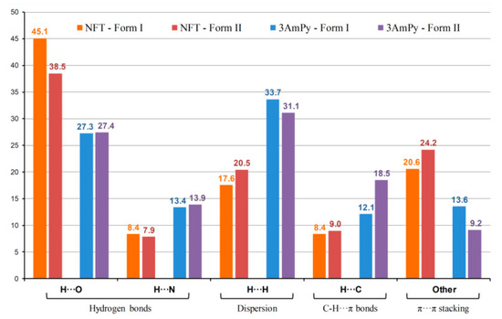 Crystal packing similarity analysis performed using the Mercury software has revealed that Forms I and II of [NFT+3AmPy] (1:1) only share a common centrosymmetric motif of two NFT molecules (2 molecules out of 15, RMS = 0.136). The performed XPac analysis [46,47] for the single- and multicomponent crystals of NFT from the CSD showed that Form I shares a common centrosymmetric dimer of NFT molecules held by π-stacking interactions with a variable offset with 17 crystal structures reported so far, including the β-form of pure NFT. According to the CSD survey results, the polar P212121 space group observed in Form II is uncommon for NFT crystals. Only one salt hydrate with L-arginine with the same symmetry (refcode ORUXEF) has been reported to date. At the same time, the centrosymmetric space groups represent 95% of all NFT crystal structures.