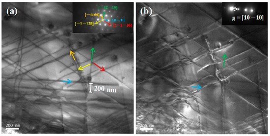 Additionally, for a higher In-content of 17%, a network of dislocation lines with an average interline spacing of 200 nm can be seen in the dark-field images obtained at g = [10–10] (see Figure 2a). These dislocations are aligned along the <11–20> direction, and two sets of dislocations are aligned along the <10–10> direction. The dark field image for g = [10–10] of the same area (Figure 2b) shows that the dislocations along the [–12–10] direction (green arrow) are invisible. Hence, b = a = 1/3[–12–10] for these dislocations, and the direction is parallel to the dislocation line. Therefore, this set of dislocations is considered to be of the screw type. Similarly, the other two sets of dislocations (yellow and red arrows) along the equivalent <11–20> directions are also verified as screw-type ones. We also found that the dislocations along the [10–10] direction (blue arrow) also become invisible under this beam condition, which means that b = a = 1/3[–12–10], i.e., it is perpendicular to the direction of the dislocation line. Hence, this set of dislocations are identified as edge dislocations, i.e., misfit dislocations (MDs). The other set of dislocations (orange arrow) along the equivalent <10–10> direction is also verified as MDs. Thus, for In = 17%, all the observed dislocations have a Burgers vector of a, with most of them being screw dislocations along the <11–20> direction, and the remaining being MDs along the <10–10> direction.