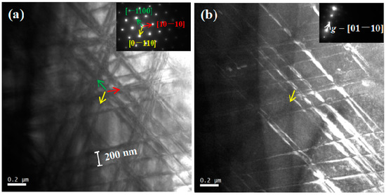 When there is a higher In-content (In = 20%), only one type of dislocation network can be seen in bright filed TEM image (see Figure 3a), unlike the previous two cases. The dislocations are aligned along the <10–10> direction, with average interline spacing of ~200 nm. In Figure 3b, we observe that the dislocations along the [0–110] direction (yellow arrow) become invisible in the dark field image obtained when g = [01–10]. Thus, b = a = 1/3[2–1–10] for these dislocations, which is perpendicular to its line direction, again classifying them as MDs. The other two sets of dislocations (green and red arrows) are also verified as MDs. Thus, all the observed dislocations are pure MDs, which contributes to the relaxation of the lattice mismatch strain. A part of the dislocations were observed to dissociate into two individual dislocations, which align along the <10–10> direction, as displayed in Figure 3. Diffraction results displayed that the individual dislocations were also of the a-type ones. This dissociation indicates that the MDs at the interface exist in Burgers vectors of both a and 2a, as reported by Liu and Li et al. [6,8].
