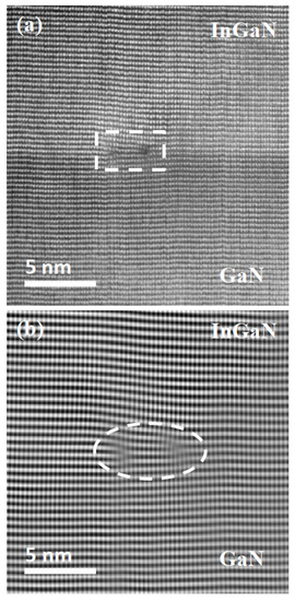 - Li, Q.T.; Minj, A.; Chauvat, M.P.; Chen, J.; Ruterana, P. Interface dislocations in InxGa1−xN/GaN heterostructures. Phys. Status Solidi A 2017, 214, 1600442. [Google Scholar] [CrossRef]