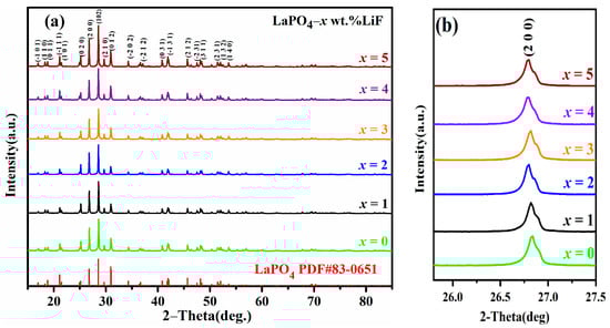 XRD pattern of the LaPO4-x wt.% LiF ceramics at the optimal sintering temperatures. (a) overall X-ray diffraction pattern; (b) local XRD trends.