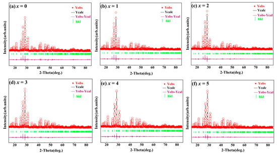 The refinement patterns of the LaPO4-x wt.% LiF ceramics at the optimal sintering temperatures ((a–f) corresponding to 1400 °C, 900 °C, 900 °C, 750 °C, 750 °C, 750 °C).