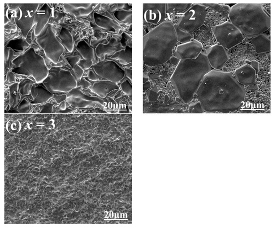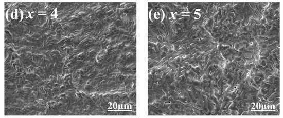 Figure 4 displays the SEM image, which illustrates the changes in the apparent morphology of LaPO4 ceramics with the increase in the amount of LiF. As shown in Figure 4a–e, when x = 1,2, the grain size is relatively large and the grain boundary is distinct. However, when x ≥ 3, the grain size begins to refine, indicating that adding LiF is conducive to grain refinement. It is worth noting that due to the melting point of LiF at 845 °C, a part of LiF melts to form a liquid phase during the ceramic sintering process. When x ≥ 4, grain boundaries begin to soften, and macroscopic defects such as pores between grains and cracks appear on the surface, which particularly impacts the apparent density and performance [29,30,31]. When the amount of LiF continues to increase, the sintering temperature does not change significantly. Excessive LiF exists on the grain surface in an amorphous state, and a small number of pores and cracks appear, which has an adverse effect on the densification of ceramics. This is consistent with the trend of relative density change and further indicates that an appropriate amount of LiF can effectively reduce the sintering temperature and porosity. Improve the relative density of ceramics.