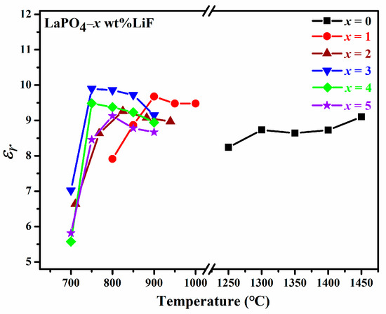 Dielectric constant (εr) of the LaPO4-x wt.% LiF ceramics sintered at various temperatures.