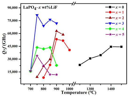 Quality factor (Q × f) of the LaPO4-x wt.% LiF ceramics sintered at various temperatures.
