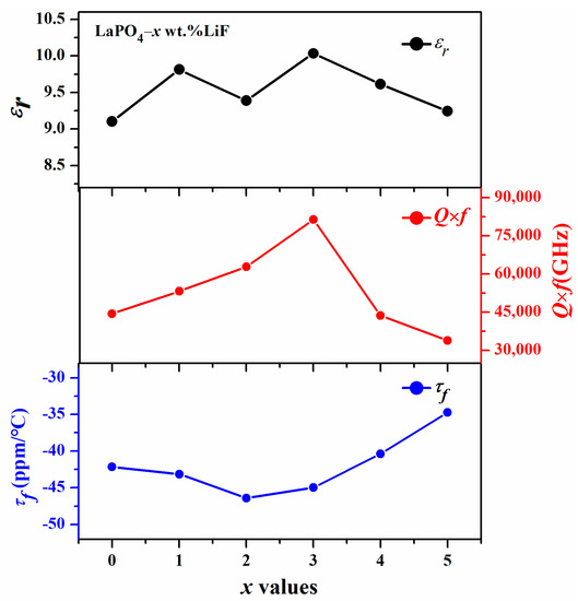 List of the microwave dielectric properties of the LaPO4-x wt.% LiF ceramics.