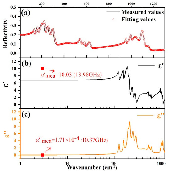 Infrared spectroscopy is an effective technique for characterizing the dielectric loss and response of ceramics. Figure 9a displays the fit of the infrared reflectance spectrum, obtained using the Reffit software and the classical resonator model with three parameters. The fitted values are in good agreement with the measured values. The complex permittivity (ε*) and reflectance (R) can be calculated using Equations (8) and (9) in the harmonic oscillator mode [36,37]: