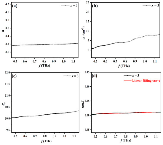 Figure 11 shows the change curve of the refractive index (n). The refractive index does not increase significantly with the increase in frequency and is stable between 3.17 and 3.21. The absorption coefficient (α) increases with the increase in frequency, which is associated with the unit volume polarizability. The dielectric constant which extrapolated from terahertz time-domain spectrum was in line with the value at microwave frequency [1,21,35]. At 7 GHz, the dielectric constant of ceramics is 10.03. At 0.5 THz, the dielectric constant of the ceramic is 10.04. Therefore, it can be inferred that the polarization mechanism of dielectric ceramic does not change in the terahertz frequency band, in which the ionic polarization is still dominant.