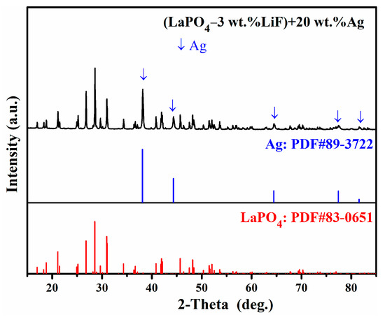 The low-temperature co-firing ceramic (LTCC) technology has garnered significant attention due to its exceptional high-frequency characteristics, low energy consumption, and compact size. Among the various components of LTCC, the focus of research has been on LTCC materials. LaPO4 ceramics have a high sintering temperature (1400 °C). Adding 3 wt.% LiF reduces the sintering temperature to 750 °C and has excellent dielectric properties. In this study, 20 wt.% Ag powder (10 µm) and LaPO4-3 wt.% LiF ceramic powder at 750 °C are mixed and co-fired at 750 °C for 2 h. Figure 11 shows the XRD results. The results show that no chemical reaction occurs after co-firing LaPO4-3 wt.% LiF ceramic and Ag, and the co-firing is a success, which provides a new idea for the future application of LTCC [29].