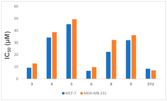 IC50 (µM) of Compounds 3–6, 8, and 9 versus the MCF-7 and MDA-MB-231 cell lines related to STU. Data expressed as the mean ± SEM from the dose–response curve of at least three experiments.