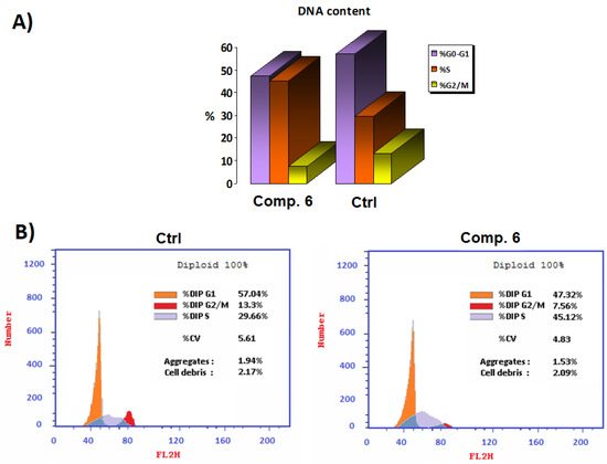 (A) Comparison of the half-maximal (IC50) concentration (µM) of Compound 6 to the untreated control cell cycle in panel. (B) Cell-cycle analysis at the IC50 concentration (µM) of Compound 6 compared to the untreated control.