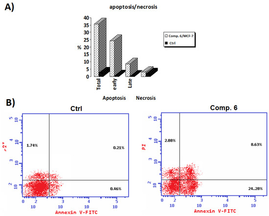 Using a fluorescent Annexin V-FITC/PI detection kit (BioVision Annexin V-FITC Apoptosis Detection Kit, Catalog #: K101by) and flow cytometry test, apoptosis in MCF-7 cultures was investigated. Compound 6 (IC50 (μM)) was added to a well containing 2 × 105 MCF-7 cells for 48 h. The cells were then removed and stained for 15 min in low light under ambient conditions with Annexin V-FITC/PI dye. A FACS Calibur flow cytometer (Becton and Dickinson, Heidelberg, Germany) was used to evaluate the samples immediately [49].