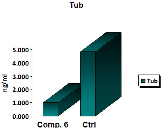 One of the main targets in anticancer therapy is the microtubules because they serve a leading role in the cells’ division, as well as in the maintenance of their shape. Many anticancer drugs exhibit their activity by sabotaging microtubule dynamics, leading to the deregulation of mitotic spindles, which causes tumor cell-cycle arrest and prompts the apoptosis of malignant cells [24,25,26,27]. A functional group substitution at a bioactive molecule’s appropriate position was found to have a significant pharmacological impact [28]. In MCF-7 cells, the newly synthesized chemical Compound 6 was tested for its IC50 inhibitory impact on β-tubulin polymerization within 24 h. The results showed that the new derivative Compound 6 displayed a strong inhibition activity against β-tubulin polymerization by decreasing the concentration of β-tubulin polymerization by 0.206-fold when compared with the positive control. These results confirmed that Compound 6 represents quite a powerful anti-β-tubulin (TUB) polymerization agent. The results of a 24-h IC50 measurement of β -tubulin polymerization inhibition in MCF-7 cells treated with Compound 6 and a control arhe shown in Figure 6.