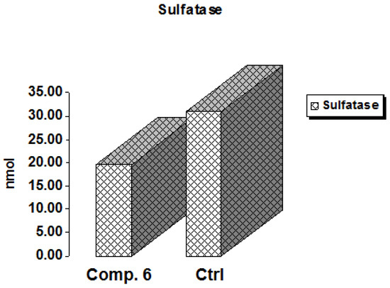 The hydrolysis of sulfate esters from a variety of biological substances, including steroids, carbohydrates, and proteins, is catalyzed by sulfatases, enzymes of the esterase class [29]. These are dispersed in a variety of cells and tissues and can be discovered in extracellular and intracellular areas. The enzyme steroid sulfatase (STS) is in charge of producing active estrogens in postmenopausal women’s breast tissue, which may subsequently lead to breast cancer [30]. Thus, sulfatase inhibition is a promising target in cancer therapy [31] because estrogens are one of the primary causes of breast cancer, according to the World Health Organization (WHO) [32]. As shown in Figure 7, Compound 6 expressed a decrease in the activity of sulfatase by 0.636-fold compared to the positive control, indicating a promising role of this derivative as an anti-breast cancer agent.