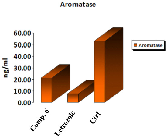 In vitro inhibitory effect of aromatase by Compound 6, letrozole, and control cells at their IC50 (µM).