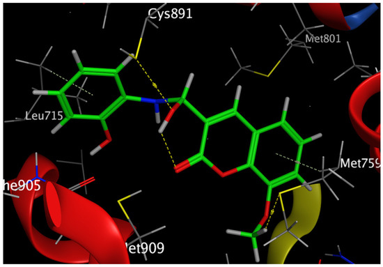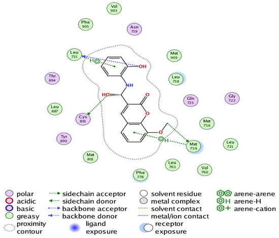 In breast cancer, PR is particularly helpful as a predictive biomarker for hormone-positive tumors. Previous research has linked elevated progesterone levels to a higher probability of developing breast cancer and the growth of both hormones receptor-positive and -negative cancers. Women past menopause who have greater than average amounts of circulating progesterone are 16% more likely to develop breast cancer. PR is a direct estrogen-inducing gene in most target tissues, where it can either cooperate with or oppose ER to modulate biological processes. Increased RANKL protein is produced when progesterone binds to PR in luminal cells and stabilizes its mRNA. Afterwards, RANKL promotes proliferation or differentiation by elevating its receptor RANK. Tumorigenesis in hormone-induced mammary epithelium is directly suppressed by RANKL suppression [42]. Our results revealed that Compound 6 bound through the phenolic-OH groups to the amino-acid residues Cys891 and Leu715. Additionally, Compound 6 bound through the ether group to the amino-acid residue Met759. In addition, the amino-acid residues Met759 and Leu715 were bound to Compound 6 by arene–hydrogen interaction.