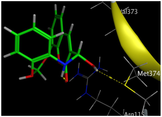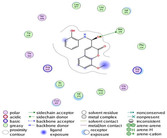 The aromatization of androstenedione and testosterone to estrone and estradiol, respectively, is the last and rate-limiting step in estrogen biosynthesis. This process is catalyzed by aromatase, which is mostly encoded by the CYP19A1 gene [43]. Several studies have shown that breast tumors overexpress aromatase in comparison to healthy breast epithelial cells, which has been associated with poor survival and the course of the illness [44]. Increased aromatase expression in breast carcinomas may also be associated with DNA polymorphisms within the CYP19A1 gene. Aromatase inhibitors have been utilized extensively in the treatment of postmenopausal breast cancer, further demonstrating the role of aromatase in the development of this disease [45,46]. Our results revealed that Compound 6 bound through the phenolic-OH group to the amino-acid residue Met374.