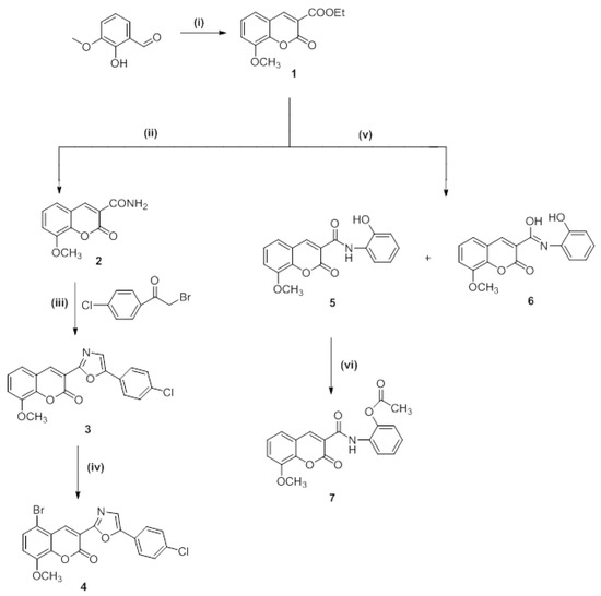 Synthesis of target compounds (Compounds 1–7). Reagents and reaction conditions: (i) Diethylmalonate, piperidine, ethanol, fusion 2–3 min at 110–120 °C, then reflux for 2 h at 75 °C; (ii) ammonium acetate, fusion then reflux for 2 h, 120–140 °C; (iii) sodium acetate, DMF, reflux for 2–3 h, 150 °C; (iv) Br2, AcOH, stirring for 5–10 min at 60 °C, then 2 h at room temperature; (v) 2-aminophenol, DMF, reflux for 3 h, 150 °C; (vi) Ac2O, reflux for 2 h, 115 °C.