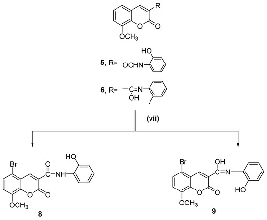 The acetoxy derivative (Compound 7) was produced by treating Compound 5 with acetic anhydride in a refluxing solution. The product of the acetylation reaction confirmed the structure of Compound 5. When bromine was added to glacial acetic acid alongside Compounds 5 and 6, the reaction produced 5-bromo-N-(2-hydroxyphenyl)-8-methoxycoumarin-3-carboxamide (Compound 8) and 5-bromo-N-(2-hydroxyphenyl)-8-methoxycoumarin-3-carbimidic acid (Compound 9, Scheme 2).