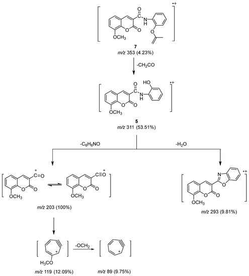 The molecular ion peak of Compound 7 (Scheme 4) underwent fragmentation by losing a ketene fragment (CH2CO) to produce a peak ion at m/z 311 for Compound 5. It further underwent the loss of C6H6NO and water molecules to give the base peak at m/z 203 and another peak ion at m/z 293. The rearrangement of the stable peak produced a peak ion at m/z 119, which was followed by the loss of the alkoxy group (OCH2) to produce a peak ion at m/z 89 related to cyclohepta-2,4-dien-6-yn-1-ylium.