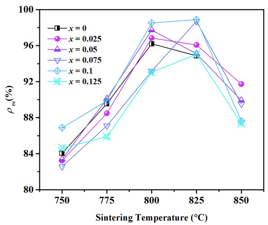 The trend in the relative densities of the Na1+xSrB5O9+0.5x microwave dielectric ceramics at different sintering temperatures is illustrated in Figure 1. The relative densities of ceramics with the same compositions initially increases and then decreases with an increase in the sintering temperature. When 0 ≤ x ≤ 0.05, the optimum sintering temperature for the Na1+xSrB5O9+0.5x ceramics is 800 °C. When x ≥ 0.075, the optimum densification sintering temperature for the Na1+xSrB5O9+0.5x ceramics increased from 800 °C to 825 °C, indicating that an excessive amount of Na can increase the optimum sintering temperature for the Na1+xSrB5O9+0.5x ceramics. In addition, a suitable amount of Na can enhance the relative densities of the ceramics sintered at the optimum sintering temperature. Remarkably, the Na1.1SrB5O9.05 ceramic sintered at 825 °C has the maximum relative density of 98.9%, which is higher than the maximum relative density of the NaSrB5O9 ceramic.