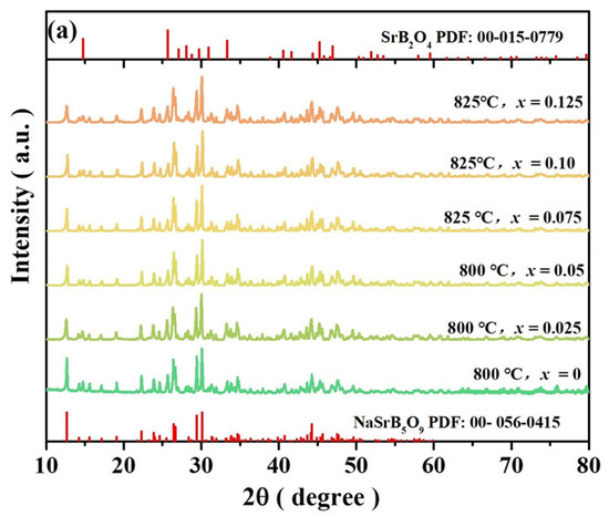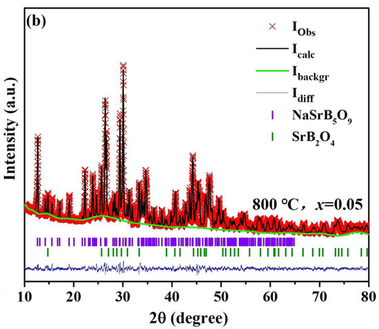 Crystal structure refinements were performed on powder samples using GSAS software. The calculated patterns of all samples closely fit those of measured, indicating that the refinement results are credible. The pattern following the refinement of the Na1+xSrB5O9+0.5x (x = 0.05) ceramics sintered at 800 °C is shown in Figure 2b. The lattice parameters and phase composition fractions are listed in Table 1. When 0 ≤ x ≤ 0.1, the unit cell volume of the NaSrB5O9 phase increases with an increase in x, probably due to the partial entry of Na+ ions into the interstitial sites, resulting in an enlargement of the unit cell volume of the NaSrB5O9 phase. When x continues to increase, the unit cell volume slightly decreases. It is noted that excessive Na can suppress the formation of the second phase, SrB2O4, and the minimum mass percentage of the SrB2O4 phase (content: 9.05 wt.%) was obtained at x = 0.075.