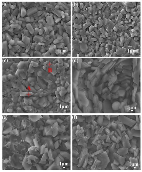 Figure 3 shows the microstructures of the Na1+xSrB5O9+0.5x (0 ≤ x ≤ 0.125) ceramics sintered at optimum temperatures. It can be seen that the grains of all samples are tightly arranged with each other, but irregular polygonal grains appear with the increase in the Na content. When x ≥ 0.05, the grain size increases, the grain boundaries become blurred, and the morphologies of the grains change in the samples. The number of nearly equiaxed grains decreases significantly, while the number of polygonal grains increases, and there are also abnormally large grains in Figure 3f.