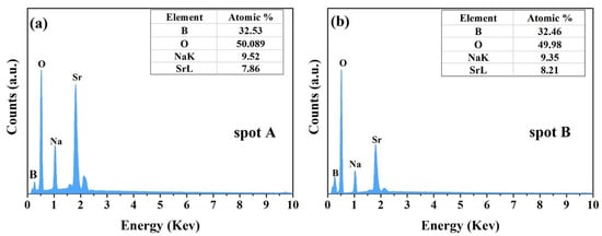 In order to analyze the elemental compositions of the polygonal grains in the ceramic samples, EDS testing was conducted on the labeled grains in Figure 3c, and the results are shown in Figure 4. The EDS elemental analysis results indicate that the elements contained in the two types of grains (A and B) are the same, including Na, Sr, B, and O, and their atomic ratios are similar, indicating that they belong to the same solid-solution phase.