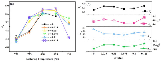 The εr values of the Na1+xSrB5O9+0.5x ceramics at different sintering temperatures are shown in Figure 5a. The εr values of all compositions increase first and then decrease with the increase in sintering temperature, which agrees well with the variation trend of the relative densities of the ceramics, indicating that the relative density is the main factor for εr values.