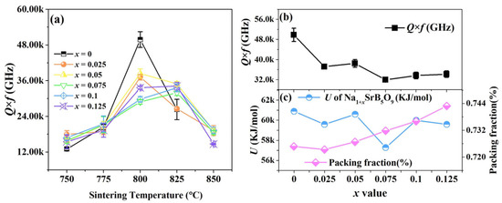 Typically, a higher lattice energy and atomic packing density lead to a reduction in the intrinsic loss and an enhanced quality factor of a ceramic material. As shown in Figure 6b, the variation trend of the Q × f values showed a positive correlation with U values and an inverse correlation with atomic packing density, implying that the lattice energy has a major impact on the Q × f value of a Na1+xSrB5O9+0.5x ceramic. The larger lattice energy corresponds to a more stable crystal structure with a minimum intrinsic loss due to non-harmonic lattice vibration.
