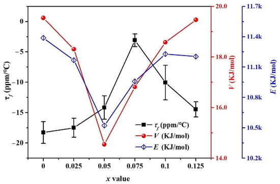 The τf values of microwave dielectric ceramics are influenced by their phase compositions, bond energies, and bond valences. Generally, a higher bond valence (V) and bond energy (E) correspond greater strengths of the chemical bonds and a smaller |τf| value. Figure 7 depicts the τf values, bond valences, and bond energies of Na1+xSrB5O9+0.5x ceramics sintered at optimum temperatures. When x ≤ 0.05, the τf values slightly increase, which is mainly related to the reduction in the second phase, SrB2O4, content. When x = 0.075, the ceramic sintered at 825 °C exhibits the maximum τf value of −3.09 ppm/°C, which is correlated to the lower second phase content and increases in the bond valence and bond energy. However, as the x value further increases, the τf values decrease due to the increase in the second phase content.