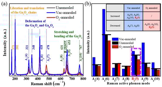 The Raman spectra of the samples are presented in Figure 2a [22]. According to the calculation of the factor group analysis at the Γ point [23], 27 optical phonon modes exist as Γopt = 10Ag + 5Bg + 4Au + 8Bu, among which Ag and Bg are Raman active, whereas Au and Bu are infrared active [24]. Although the Raman mode intensity can be affected by the crystal orientation and surface content of the vibrating group [23], the information on the latter is believed to be dominantly reflected by the Raman measurements because the crystal orientation and test conditions of the samples are completely consistent. All peaks are normalized via calibration based on the Si substrate. Compared to the pristine sample, the Raman peaks that vary predominantly for the annealed samples are listed in Figure 2b. Although the Bg(5) mode is believed to be dependent only on Ga(I) and O(III) [25], its weakness for the O2-annealed sample implies the reduction in Ga(I) instead of in O(III) because the concentration of O(III) is difficult to drop in an oxygen-rich ambience due to the large energy formation (Ef) of VO(III) around 4.7 eV [11]. As a result, the weakened Bg(5) strongly suggests an increase in Ga-related vacancies with reduced Ga(I) concentration. On the other hand, the strengthened Bg(5) mode of the vacuum-annealed sample demonstrates an increased O(III) concentration, which results from the recovery with Oi point defects, as discussed later. Additionally, Raman modes other than the Bg(5) mode are related to at least three types of atoms [25], which makes it difficult to provide solid evidence.