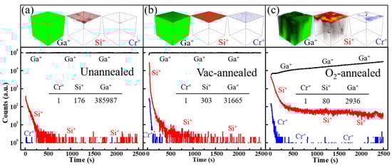 The in-depth SIMS profile of Ga, Si, and Cr for the (a) unannealed, (b) vac-annealed, and (c) O2-annealed Ga2O3.