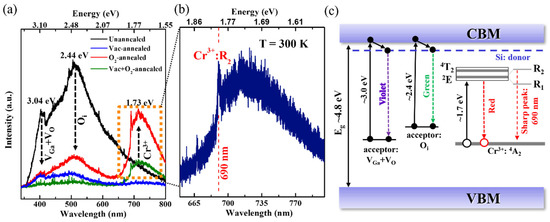 Interestingly, a broadband red PL peak centered at 716 nm is observed only for the sample annealed in O2, which is associated with a spike peak (690 nm) on its shoulder (Figure 4b). An additional pristine sample is sequentially annealed in a vacuum and oxygen ambience to verify the existence of the red PL peak, which also appears (Figure 4a: green line). Although the defects of are located at 1.7 eV below the conduction band, which corresponds to a wavelength of around 716 nm [11], it should not be the origin of the red PL peak because VO is difficult to form in oxygen ambience due to its high formation energy of 4.7 eV [10,11]. Furthermore, the broad red PL peak can be attributed to the electron transitions from the 4T2 and 2E states to the 4A2 levels of the Cr3+ impurities [28,29,30,31,32], which are generated by recharging Cr2+ during thermal annealing to shift the Fermi level away from the conduction band [21,22]. As for the spike peak at 690 nm, the transition of the 2E:R2 states to ground 4A2 is believed to be the dominant origin [18,33,34].
