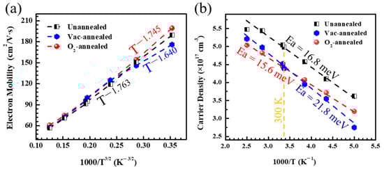 Temperature-dependent Hall measurements were conducted to further explore the annealing effects. As shown in Figure 5a, the electron mobility of the three samples in this study is comparable at 300 K, which is 100 cm2/V·s, and is in good agreement with previous studies [10,35]. The carrier mobility was mainly determined using lattice vibration scattering and ionized impurity scattering, which can be expressed as exponents T−1.5 and T1.5, respectively [36]. The closest exponent to the theoretical T−1.5 for the vacuum-annealed sample suggests its improved crystallinity to enhance lattice vibration scattering, as supported by the reduction in both Oi and VGa+VO defects (the fitting process is shown in Supplementary Table S1).