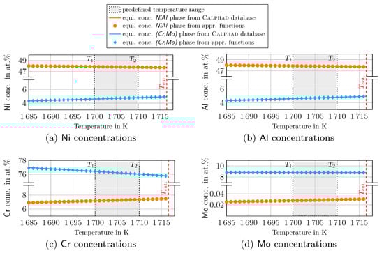 Due to the simplifications made in the description of the thermodynamic energies, their accuracy has to be checked. Following the validation from Noubary et al. [15], the subplots in Figure 2 show the equilibrium concentrations calculated from the Calphad database (solid lines) and from the Equations (10)–(12) (symbols), respectively. For all four concentrations an excellent accordance can be found not only in the predefined temperature range between and (gray area) but also up to eutectic temperature , marked with a red dotted line, and also down to below . It can be expected that also for smaller temperatures a good accordance can be achieved. However, as such low temperatures are not expected to appear within the simulations a further validation of the equilibrium concentrations is omitted. Within the investigated temperature range from to the average deviation between the equilibrium concentrations of the solids calculated from the derived Gibbs energy functions and the equilibria calculated from the Calphad database is ∼0.1%. The maximum deviation of ∼0.9% is found for the Mo concentration of the equilibrium concentration of NiAl at the lowest temperature of . Despite the simplifications made in the modeling of the thermodynamic energies, this good agreement shows the suitability of the generated functions for representing the thermodynamic system and thus the applicability of the approach presented for their approximation.