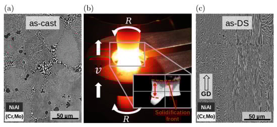 The desired eutectic composition of NiAl-31Cr-3Mo (at.%) was synthesized by using the elements Ni, Al, Cr and Mo of , , and purity, respectively. The alloy was manufactured by using an arc-melting device provided by Edmund Bühler GmbH (Germany). The device chamber was evacuated multiple times and purged with Ar to ensure an oxygen-lean operation atmosphere. Furthermore, a lump of Zr metal was melted prior to the melting process, in order to remove the residual oxygen in the chamber. To achieve sufficient homogeneity, the produced buttons were flipped and re-melted at least five times. For the directional solidification the buttons were cast into a rod-shaped Cu mold. The rods were 12 mm and 170 mm in diameter and length, respectively. No specific loss of a certain element during arc-melting was noticed and an overall mass loss lower than 0.3 wt.% was measured. Therefore, the changes in alloy composition by evaporation are considered negligible. The worldwide unique crucible-free zone melting device used in this work is described elsewhere in detail [61]. The experiments were performed in an Ar atmosphere with a continuous Ar flow rate of 1.5 . During the DS process, the sample rotates about its axis and moves upward (lift) through the induction coil that is used to heat up and locally melt the material, as shown in Figure 3b. The rotation speed R was kept constant at and the process velocity varied from (v) to (v). For microstructural analysis, samples were cut by electro-discharge machining parallel and perpendicular to the growth direction (GD) and were prepared by standard metallographic procedure. Scanning electron microscopy was performed using backscattered electron imaging (SEM-BSE) on a Zeiss EVO50 microscope by Carl Zeiss AG (Germany) at and a spot size of 500.