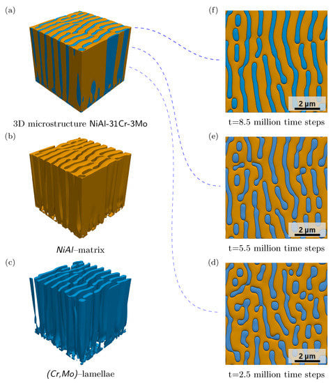 For further studies and the correlation with experimental results, three-dimensional phase-field simulations are performed. The resulting microstructure after million time steps for the growth velocity v102 is displayed in Figure 5a. The microstructure contains blue (Cr,Mo)–lamellae within an orange NiAl–matrix. Both phases are individually illustrated in the sub-figures Figure 5b,c, respectively. The sub-figures on the right side of Figure 5 visualize the solidification front of the evolved microstructures after , and million time steps. Starting from a mixed structure of mainly fibers and short lamellae at million time steps in Figure 5d, a lamellar structure with single isolated fibers has evolved after million time steps in Figure 5e. In the last 3 million time steps, this lamellar structure is established by the consolidation of longer lamellae. The final microstructure in Figure 5f shows a well-aligned mainly lamellar structure. By continuing the simulation, it can be assumed, that the remaining elongated fibers in the upper left corner of the microstructures will also connect to a further lamella.