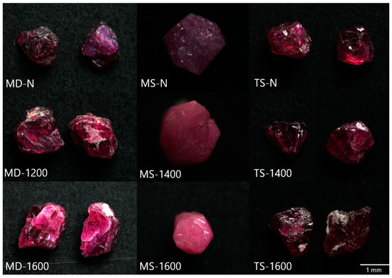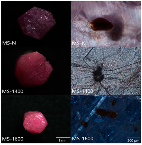 - Kitawaki, H.; Shimizu, K.; Kuroda, D. Effect of Fe content and heat treatment on the color of ruby. J. Gemmol. 2019, 36, 598–604. [Google Scholar]