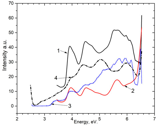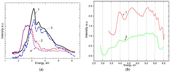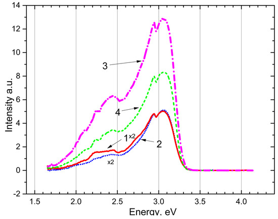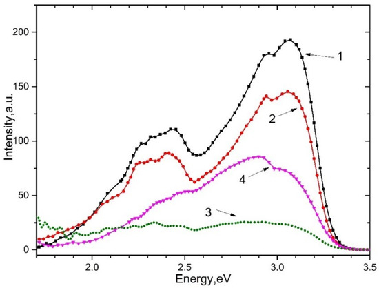 The photoluminescence of and irradiated (curves 1 and 4) and unirradiated (curves 2 and 3) with x-rays upon excitation by 5.6 eV photons at a temperature of 80 K is shown in Figure 5. It can be seen that emission associated with with an impurity of at ~2.3–2.4 eV and emission bands at ~2.95 eV and ~3.1 eV are arisen. The emission bands at 2.95 eV and 3.1 eV refer to intrinsic and impurity electron-hole trapping centers.