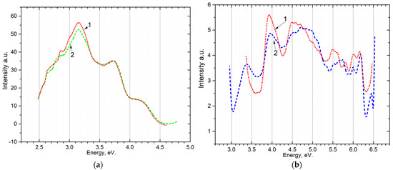 Following this, an analysis on the excitation spectra (as shown in Figure 6) of the emission center of Mn2+ impurity for the 2.3–2.4 eV band at 80 K, for (curve 2) and (curve 1) was conducted. As can be observed, excitation occurs in three spectral ranges: near 3.35 eV, 4.0 eV, 4.5 eV and the spectral interval 5.0–6.2 eV. The fundamental spectral area of the host is defined as 5.0–6.2 eV. New electron-hole trapping centers are formed in this region.