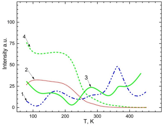 Temperature dependence for emission bands: 1—2.3–2.4 eV upon excitation of 5.9 eV ; 2—2.95–3.1 eV upon excitation of 4.5 eV in ; 3—2.95–3.1 eV upon excitation of 5.9 eV ; 4—2.3–2.4 eV upon excitation of 4.5 eV .