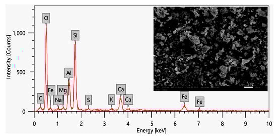 In this work, the red clay was used as a binder for marble dust and micro- or nano-barium oxide. The red clay was obtained from Aswan city in Egypt, dried and sieved with a 60 μm sieve. The SEM imaging and EDX analysis of the red clay was performed before the composite preparation, as shown in Figure 1, using a scanning electron microscope of the type SEM-IT 200, JEOL, with an accelerating voltage of 20 keV. The elemental percentages of the red clay are tabulated in Table 1.